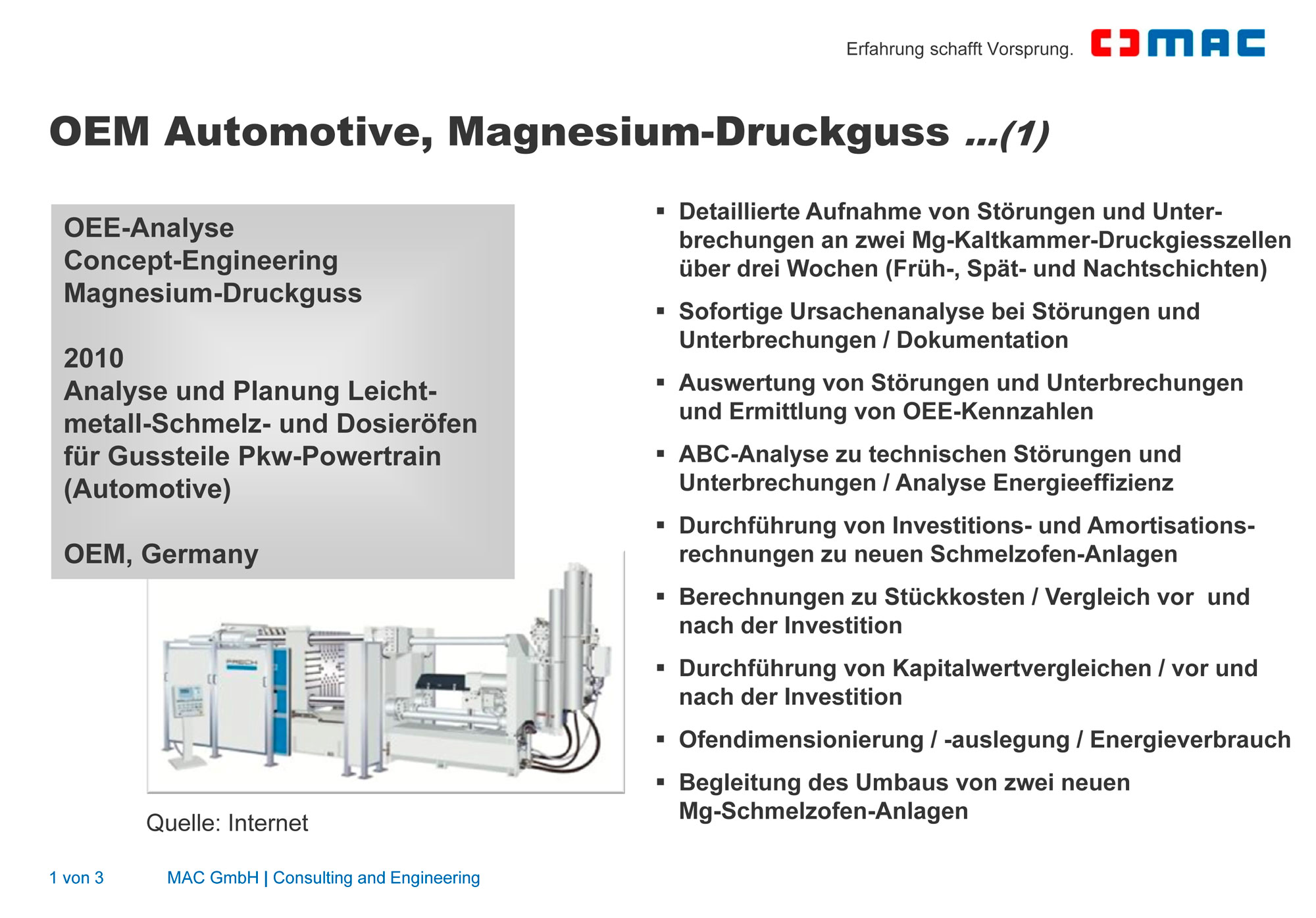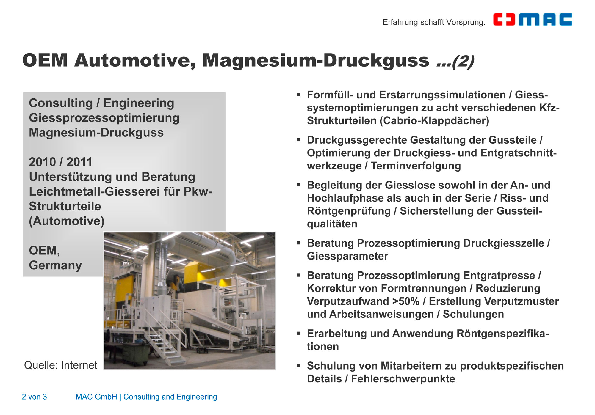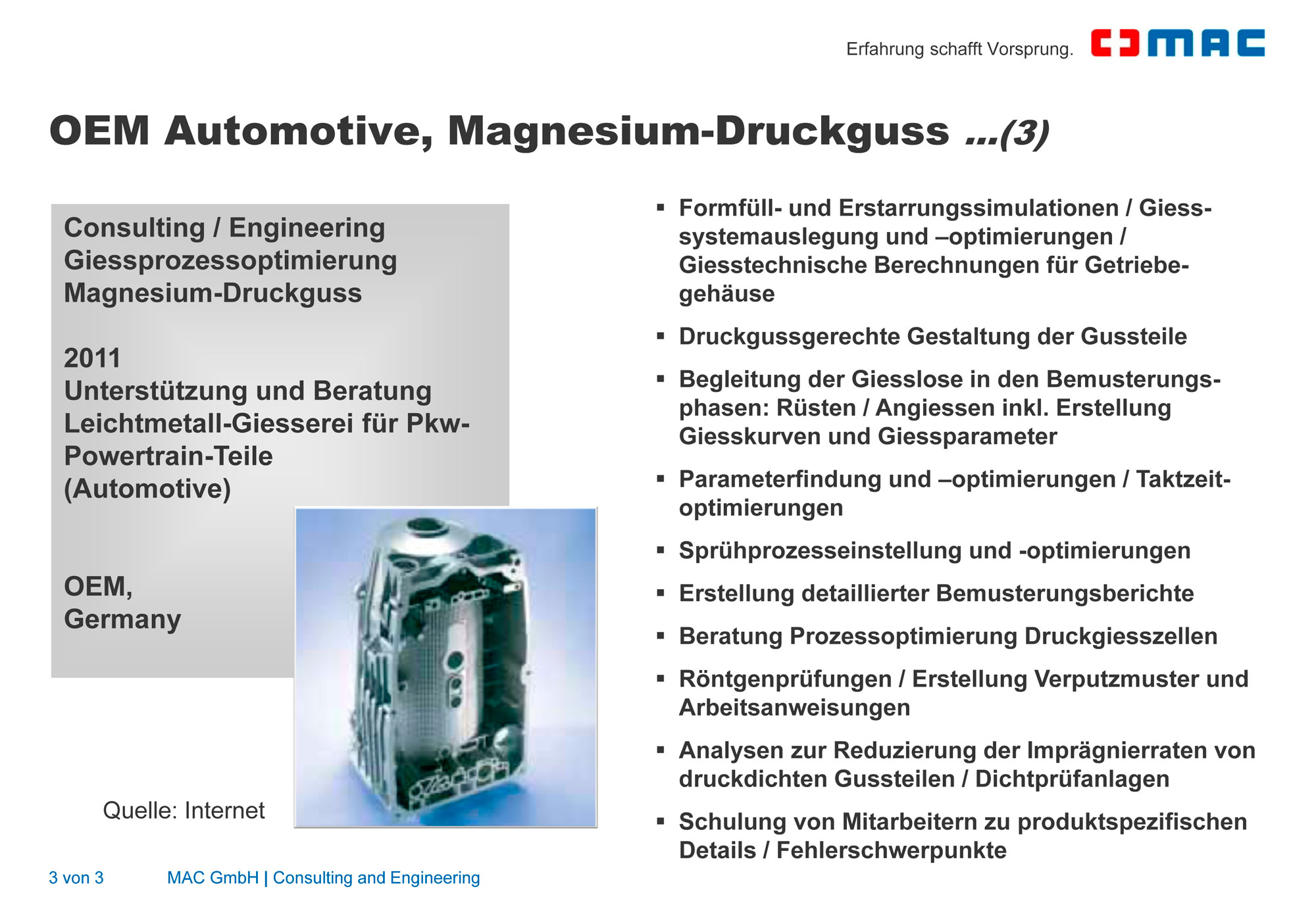 Von Juni 2010 bis April 2012 haben wir im Bereich Mg-Druckguss vor Ort in der Giesserei mit Hilfe eines als «Resident Engineer» eingesetzten MAC-Druckguss-Ingenieurs unseren Kunden intensiv unterstützt und ein Projekt mit verschiedenen Schwerpunkten durchgeführt.